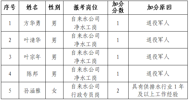 根据《乐玩网页版招聘公告》规定,“对报名参加自来水公司净水工岗位的考生如满足退役军人身份给予综合成绩加1分,荣获个人三等功以上的退役军人给予综合成绩加2分,具有供排水行业1年及以上工作经验者给予综合成绩加2分。对报名参加自来水公司行政专员岗位的考生如具有供排水行业1年及以上工作经验者给予综合成绩加2分”。现对报考人员申请加分的审核工作已全部结束,经审核符合加分条件的人员共5人,现予以公示,接受社会监督。公示时间为2020年11月13日—11月15日。公示期间,如对加分情况有异议,请向黄山市徽投集团反映。公示期满后,如无异议的,按规定程序办理加分手续,逾期不再补办。联系电话:0559-6525368,15665592628。