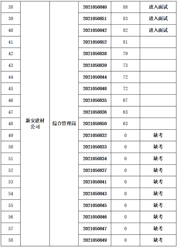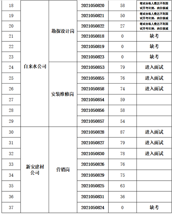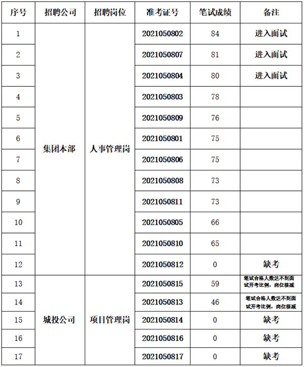 根据《黄山徽投集团下属子公司招聘员工考试公告》,笔试工作已于2021年5月9日上午结束,现将笔试成绩及进入面试人员名单公布如下: