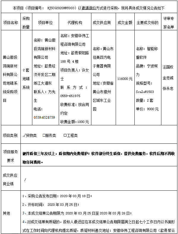 黄山徽投鸿瑞新材料有限公司地磅系统采购项目成交结果公告