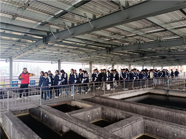 在参观过程中,细心的同学们也发现二水厂铺设了很多的光伏板。“这是自来水公司与黄山市新安江水电发展有限公司共同建设的,实现绿色能源并网用电,既合理利用了土地资源,节约投资成本,也为生态环境保护、绿色低碳发展做出贡献”。工作人员介绍说。